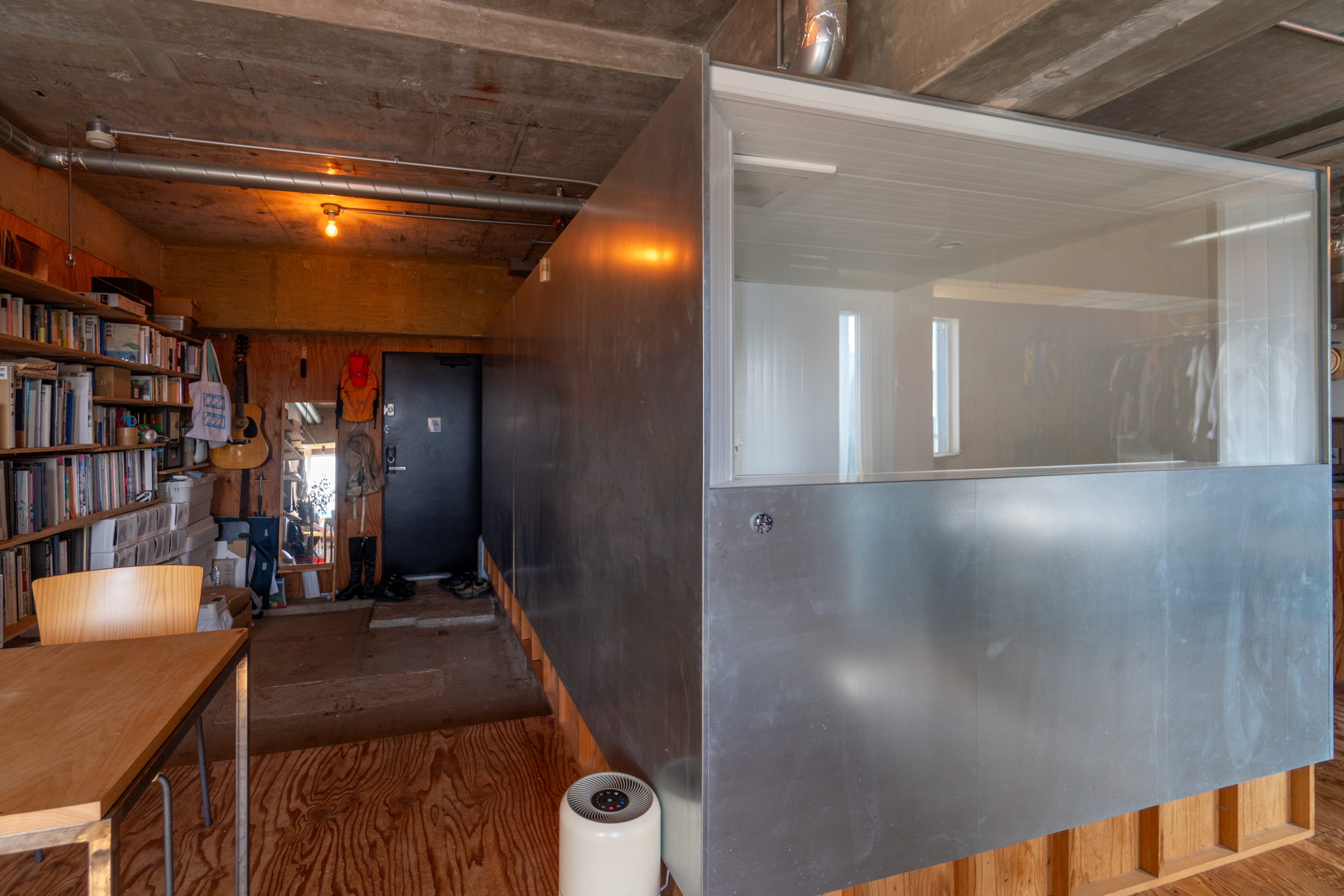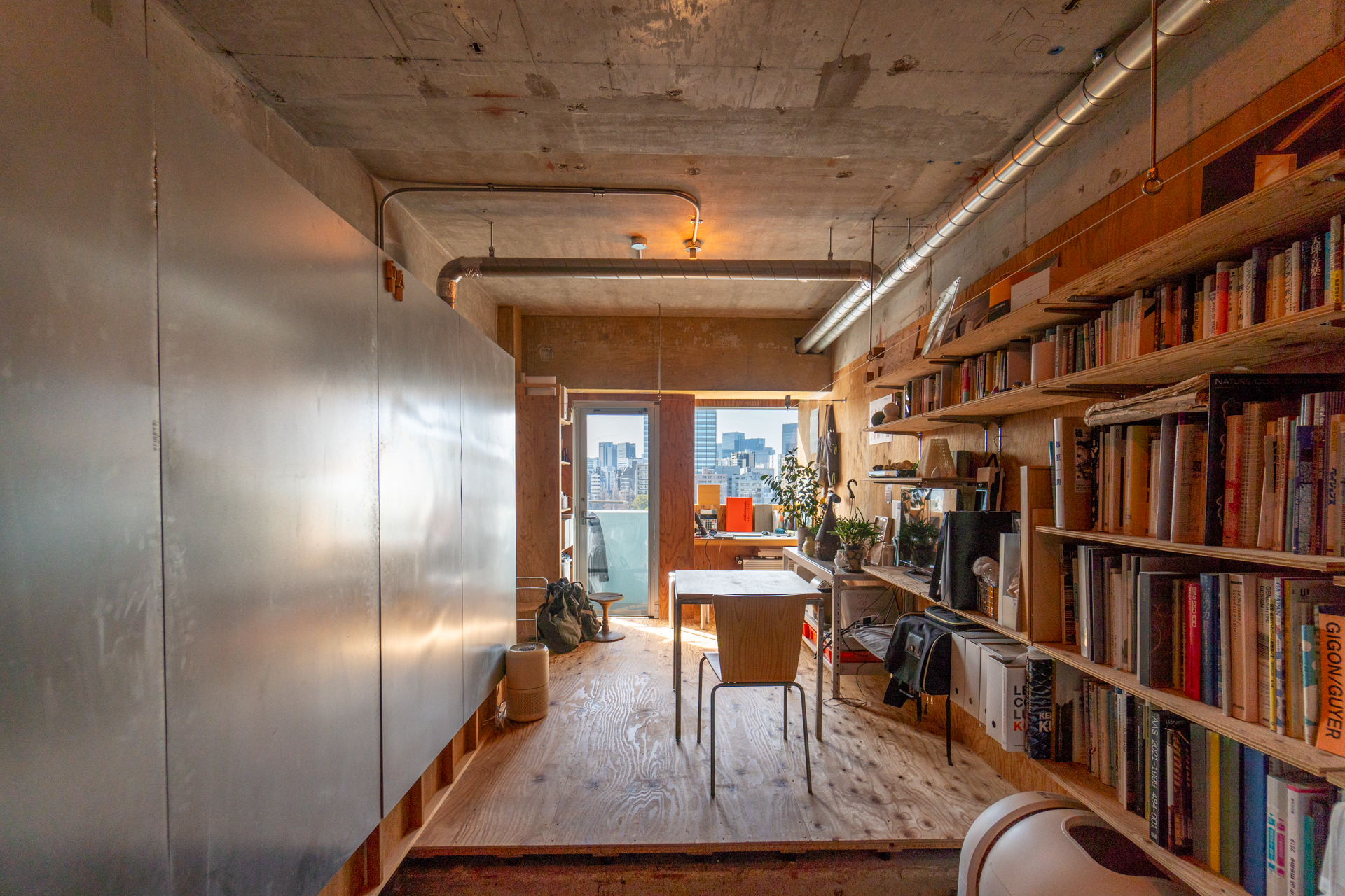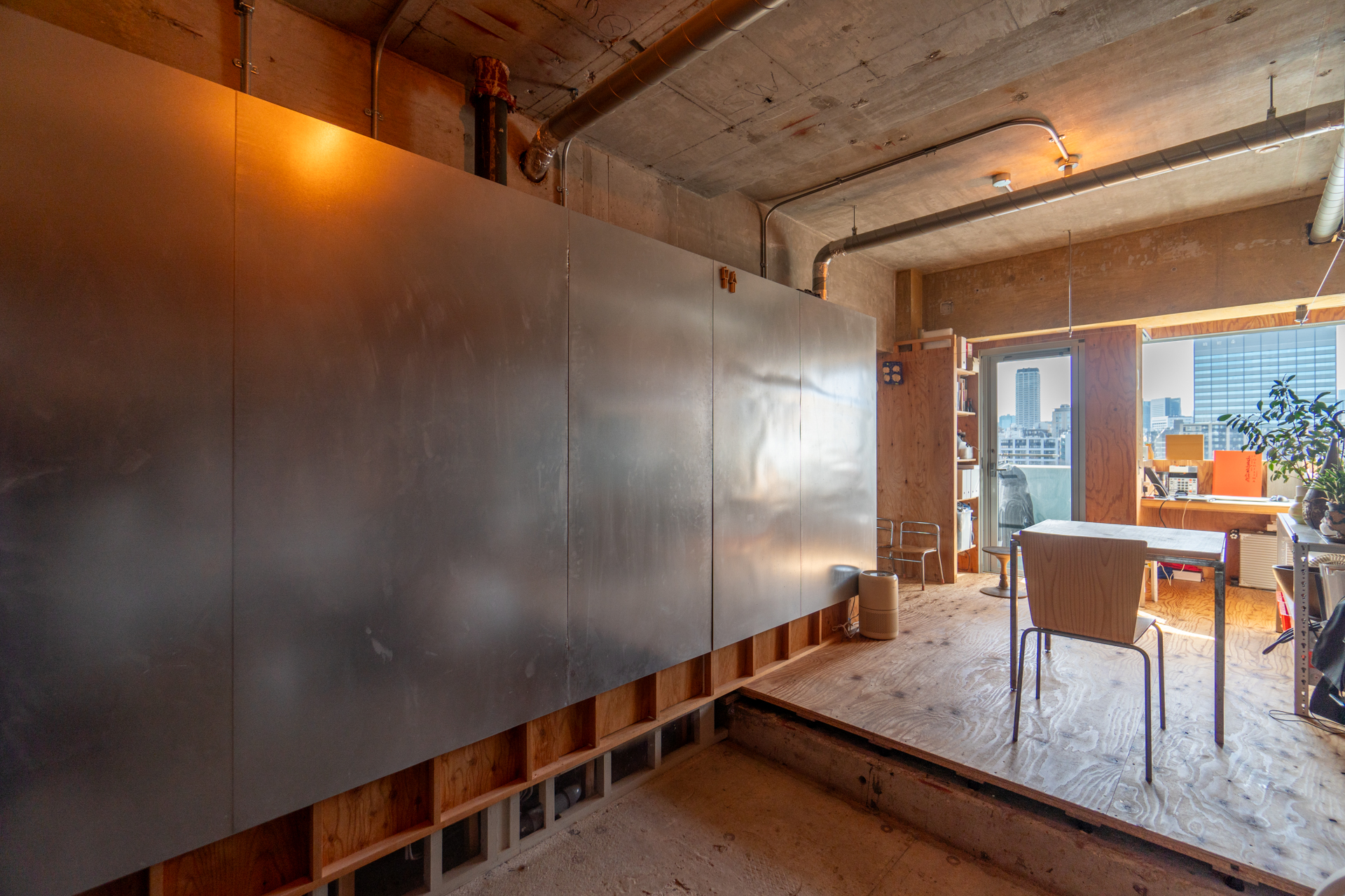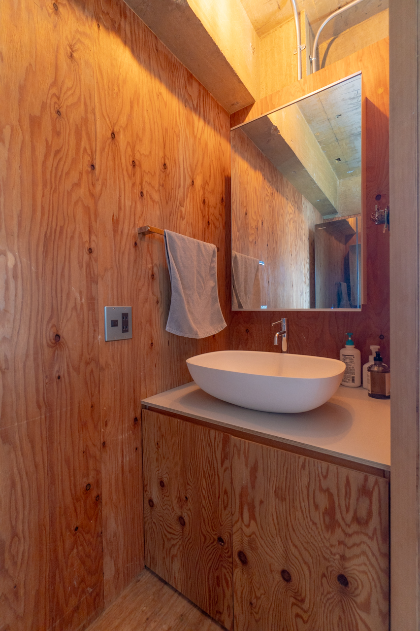 とても面白いのはバスルームまわり。バスルーム・トイレ・洗濯機置き場をまるっと1つの箱に閉じ込め、その箱をまるで間取りの中の1つのピースにはめ込むようにお部屋の中心に配置しています。バスルームはリビングに面しており、その上半分にフレームのような窓を作り自然光を取り込んでいます。ラーチ合板の床壁の内装の中でも目をひく水回りを囲う鉄板には、隅田川の水面のゆらぎが映り込み素材とデザインの化学反応を感じることができます。