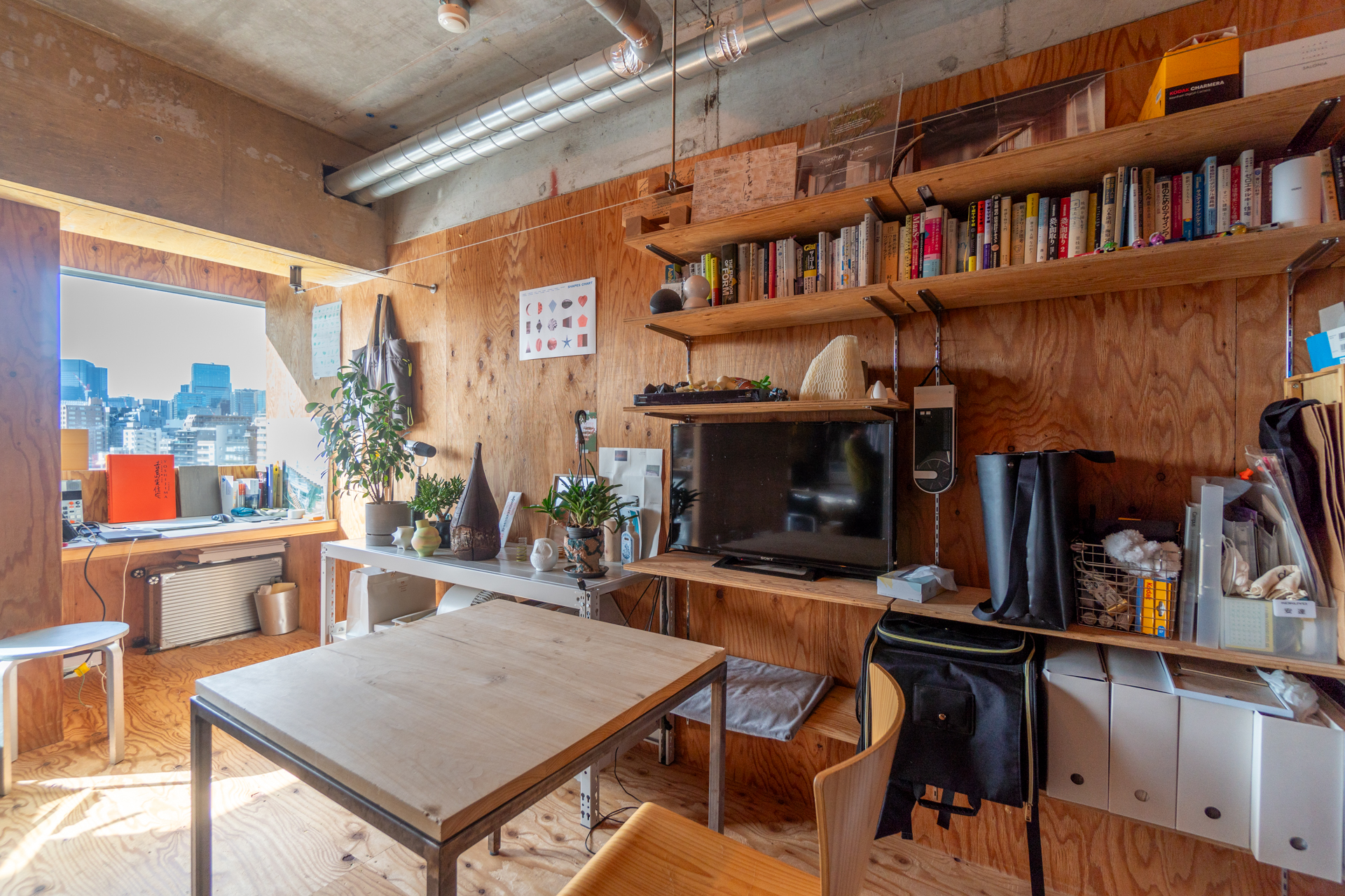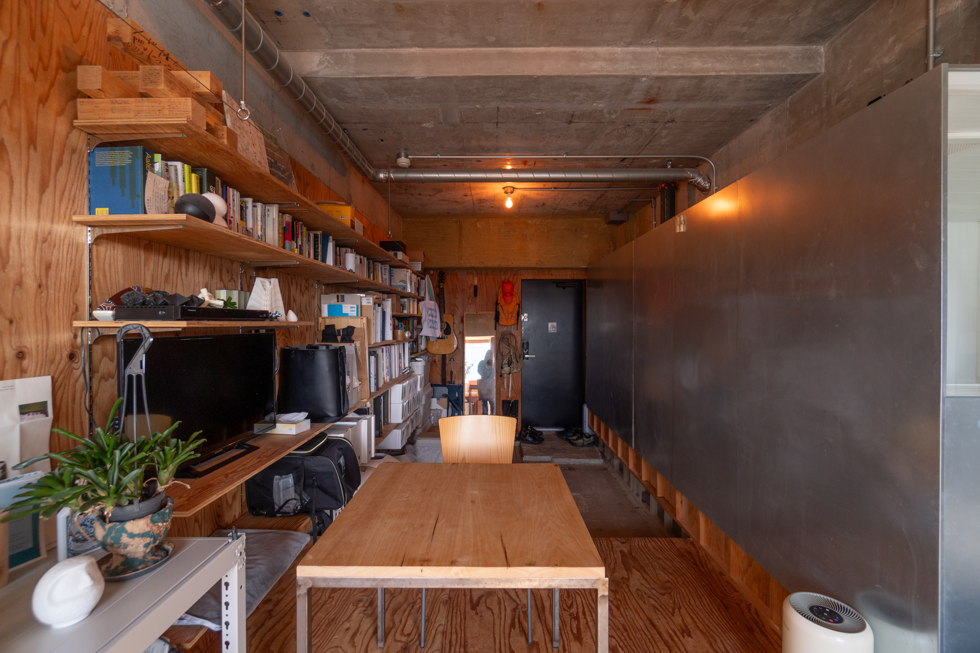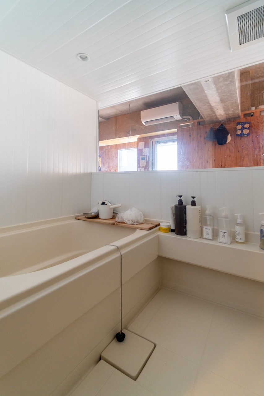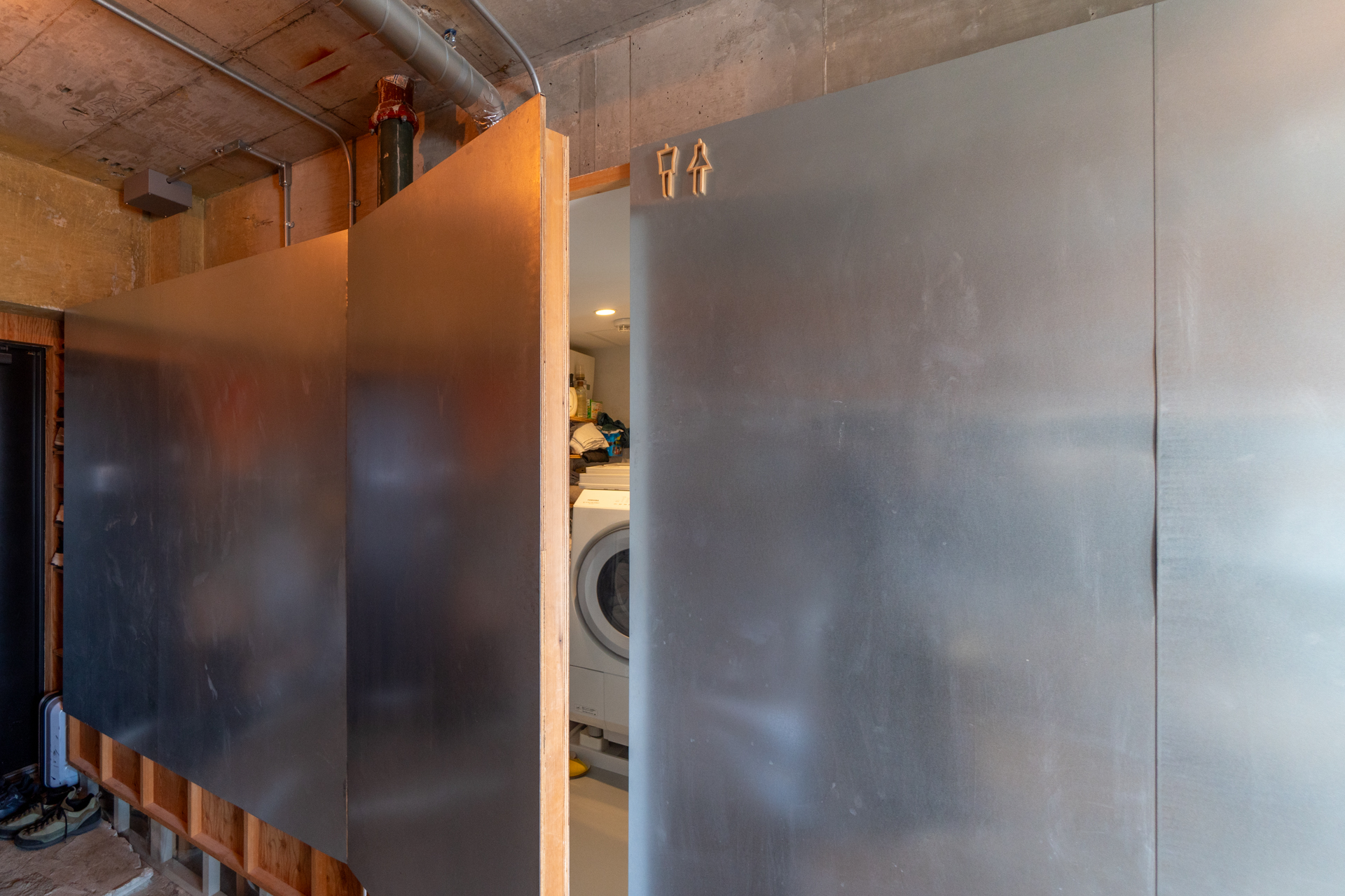 とても面白いのはバスルームまわり。バスルーム・トイレ・洗濯機置き場をまるっと1つの箱に閉じ込め、その箱をまるで間取りの中の1つのピースにはめ込むようにお部屋の中心に配置しています。バスルームはリビングに面しており、その上半分にフレームのような窓を作り自然光を取り込んでいます。ラーチ合板の床壁の内装の中でも目をひく水回りを囲う鉄板には、隅田川の水面のゆらぎが映り込み素材とデザインの化学反応を感じることができます。