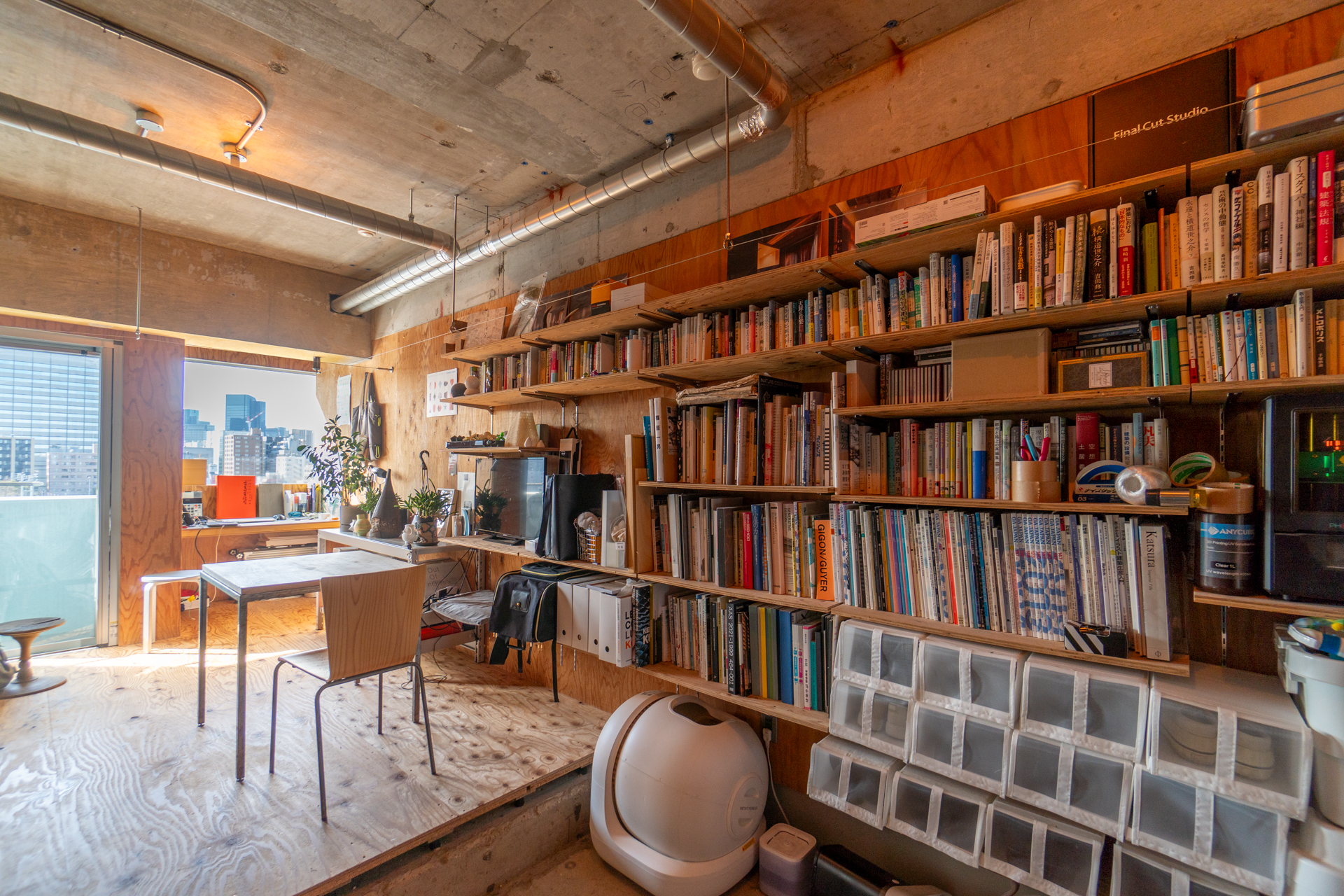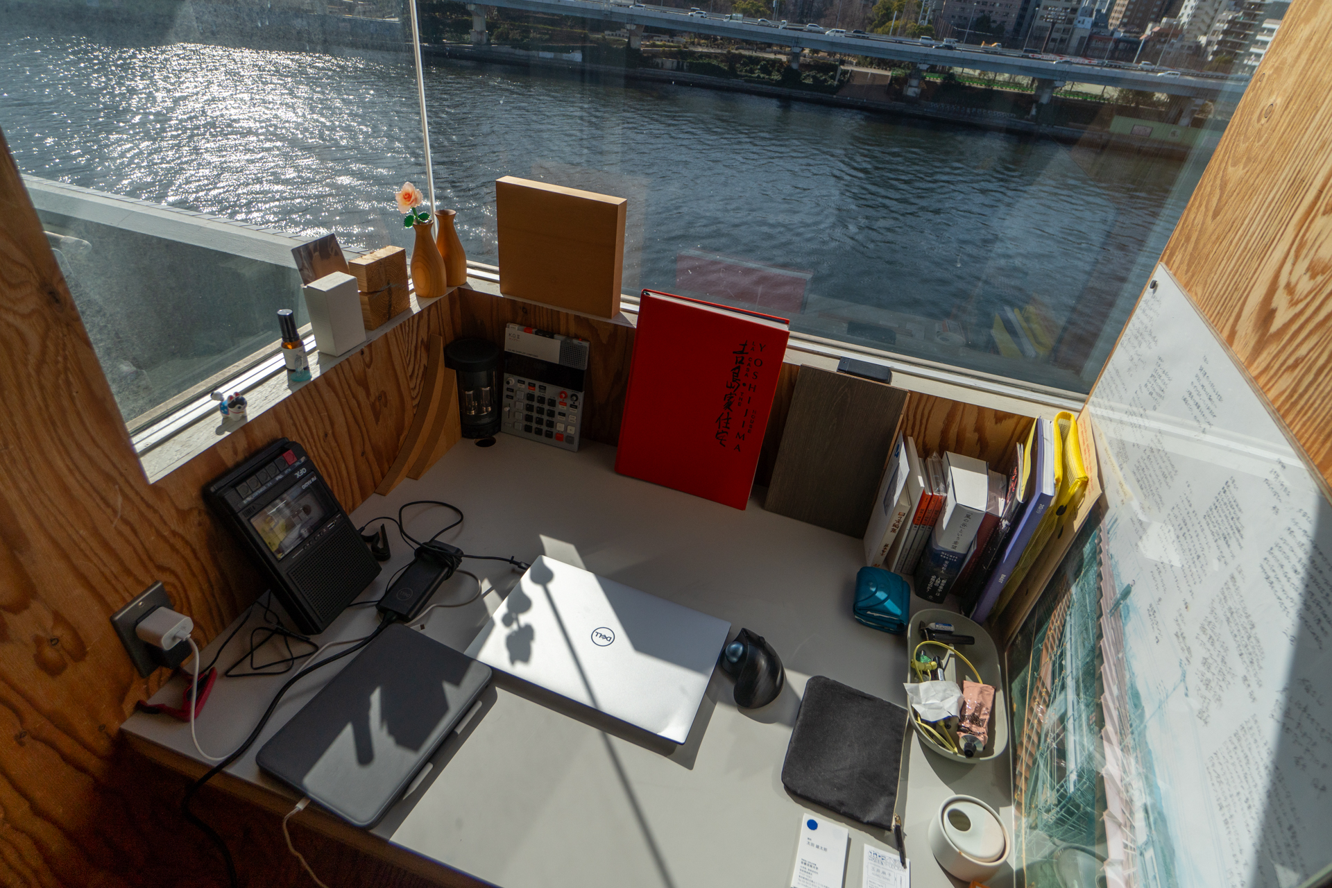 この大きなワンルームはLDKなどの概念を超え設計されており、そのコンセプトの中心に“川との共存”が感じられます。まず南西側はほぼ窓ですが窓自体にカーテンを付けることはせず、手前側の梁に走らせたワイヤーに透明のカーテンなどを設置して、部屋に入る光の量を調節しながらも、緩やかに空間を分けられる工夫がされています。