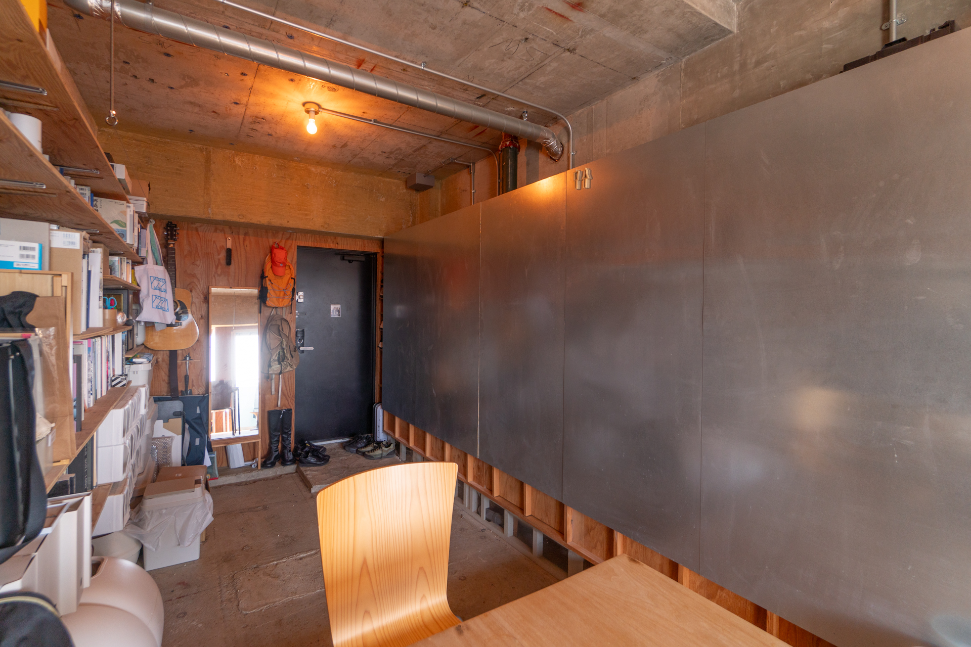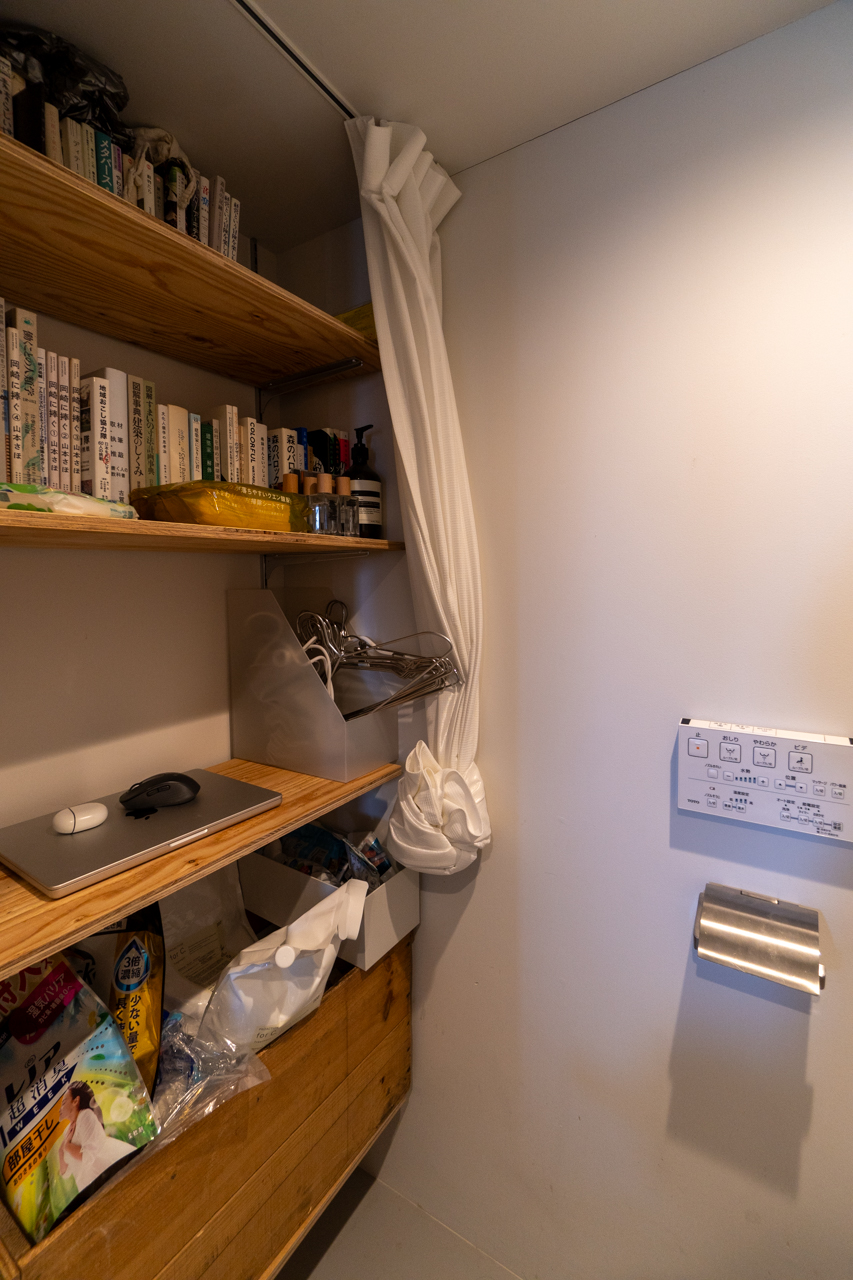 玄関から入ってすぐの土間スペースには、壁一面に高さ調節可能な造作の棚があります。そうでした、あまりにシームレスな設計なので収納をするという概念をつい失念してしまいます。棚の手前側にはワイヤーが走っているため、思い切り荷物を置いて目隠しのカーテンを走らせてしまうのも手ですね。