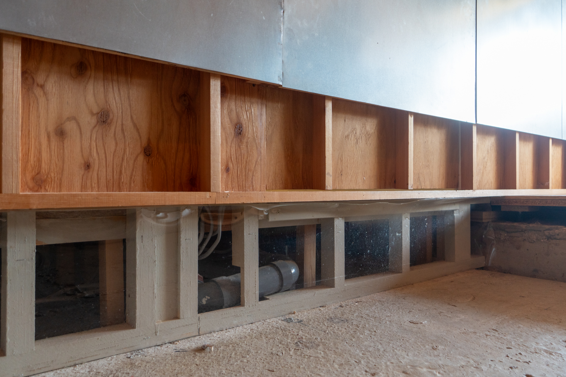 梁下のボードと水回りの鉄板の上部ラインの高さが同じ