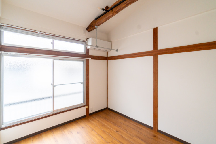 サイザル麻の床材の寝室は約9畳とゆったりとした広さ。明るく眺望がいいので、広さ以上の開放感を感じられます。壁一面のオープンなクローゼットは押入れ2間分のスペースがあるので、お気に入りの収納家具を並べる楽しみがあります。
